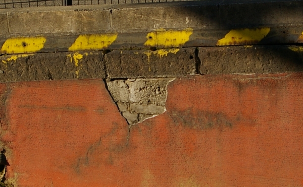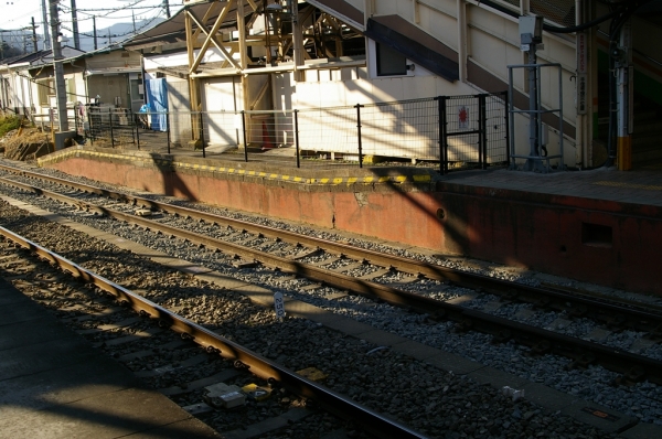 2番線ホーム相模湖寄り(南側)先端。外壁が赤いセメントで塗りつぶされているが、セメントが剥げ落ちた部分に煉瓦積みプラットホームを確認することができる。積み増しされずに、元のホームの高さを留めている部分が残っている。甲武鉄道時代のものと思われる。