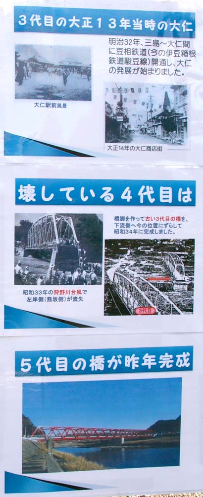 2007年に竣工したばかりの大仁橋。正面に大仁金山跡がある。この時はまだ周辺の整備が済んでなかったようで、大仁橋の歴史や工事を紹介するパネルが近くに設置されていた。