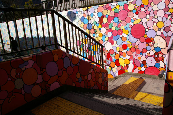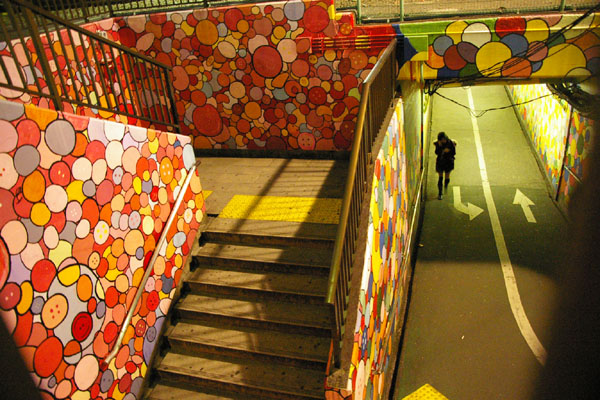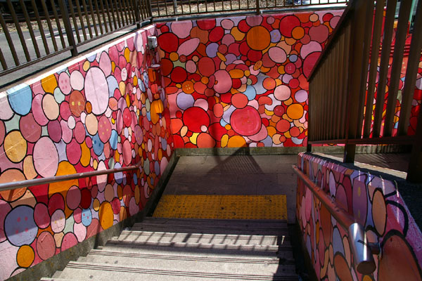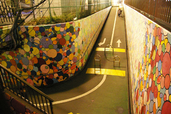 立川駅東側の可愛い連絡地下道 立川市 2009.02.04 2022.06.09 JR立川駅の東側にある北口と南口を結ぶ、可愛い塗装を施した連絡地下通路。2009年当時は塗装したてだったのか、かなり鮮やかだったが、5年経った2014年現在、残念ながらかなり色あせてしまっている。 国土地理院1:25000地形図 立川(東京) Google Maps ストリートビュー 公共施設