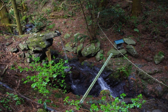 ▼舗装路が途切れ、登山道に入るところに小さな滝や石碑がある