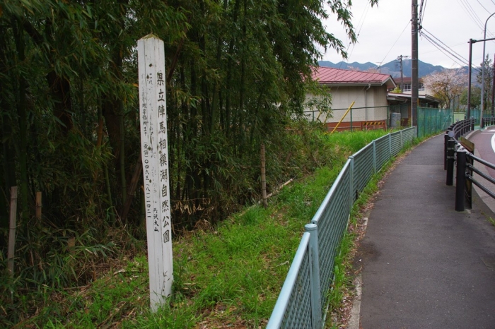 ▼周囲に何もない道路沿いに古びた県立陣馬相模湖自然公園の道標がたててある