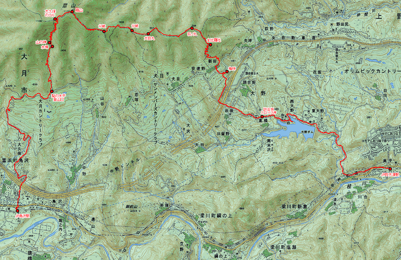 | コース:鳥沢駅→富浜町鳥沢の古い蔵→梨ノ木平(登山口)→水場→山の神→大久保のコル→扇山(山頂)→犬目丸→金比羅社→新田集落→談合坂入口バス停→大野貯水池→四方津駅 天気:くもり |