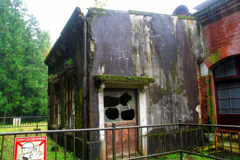 丸山変電所の表側はすっかり修復されてしまっているが、裏に回るとコンクリート造の部分が廃墟のままだった。しかし柵に覆われて近づくことはできない。