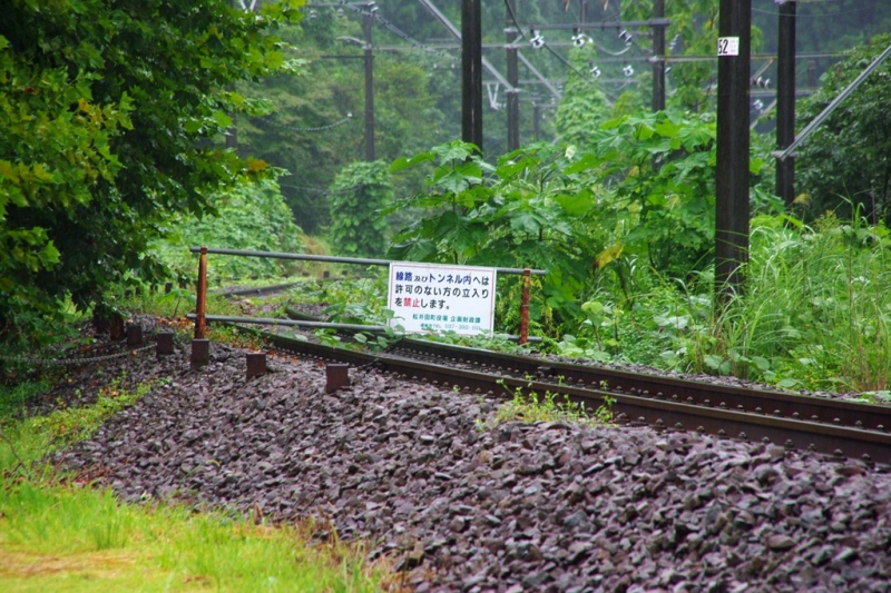 旧碓氷第10トンネルを出ると、そこは熊ノ平駅の跡地。工事業者が様々な機材や資材を置いている。作業員さんと少し挨拶をかわした。熊ノ平はアプトの道コースではないので、何か言われるかと思ったが、そんなことはなく、軽井沢のほうに行きたいといったら「このトンネルをまっすぐ行けば軽井沢につく」と言われ、安心して(?)突き進んでいった。最後のトンネルを抜けたところで「立入禁止」の札を目にした。今はもっと管理が厳しくなっているかもしれない。