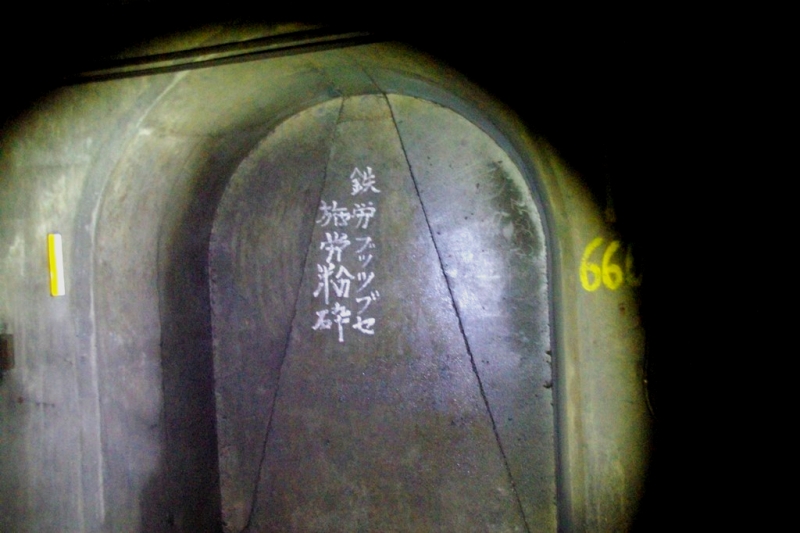 碓氷第9ずい道(下り線)内の退避坑に書かれた「鉄労粉砕」の文字