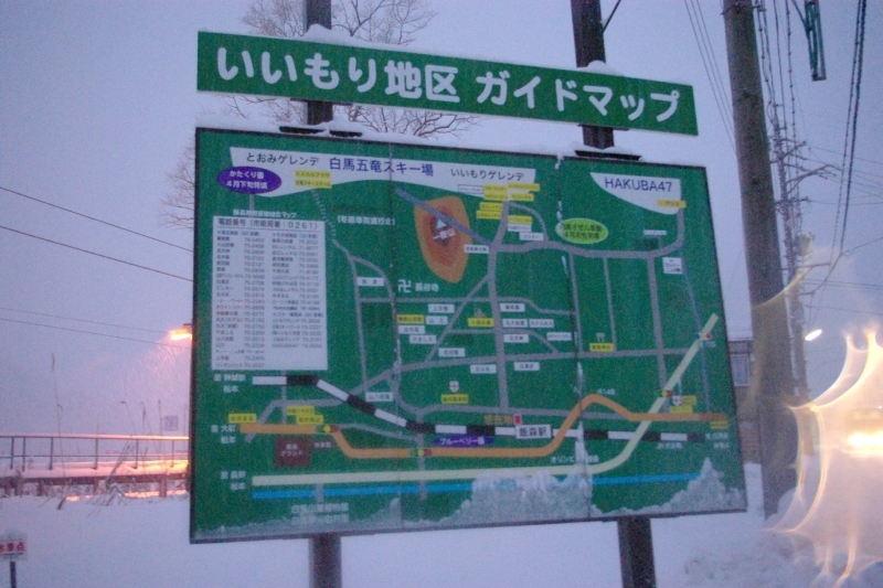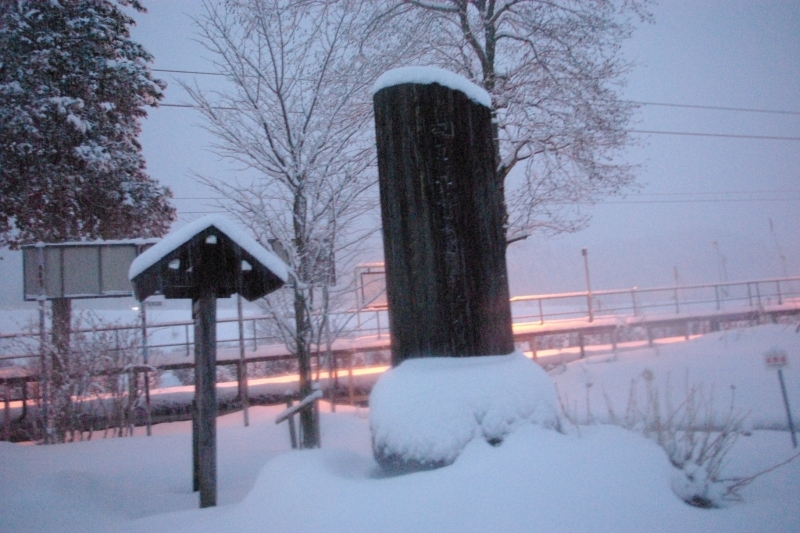 スキーに行く客らしき団体の人達(地元の人?)が駅周辺に集っていた。駅前には大きな石碑や観光案内図 などがあったが暗くて何が書いてあるかほとんど分からず。