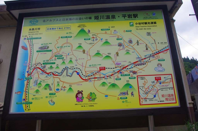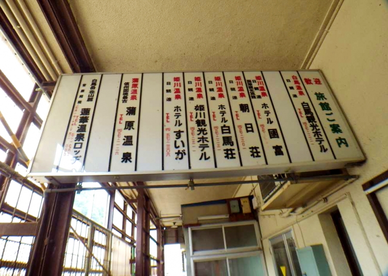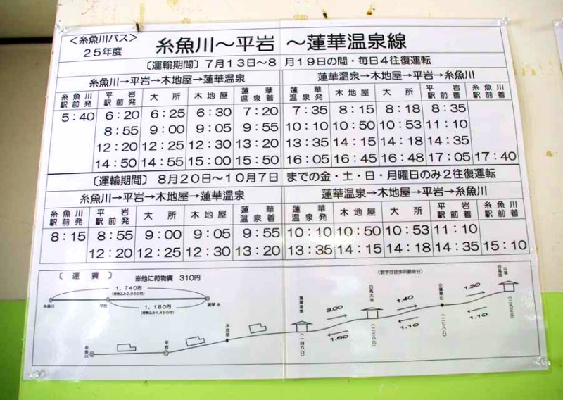 駅舎内に貼ってある蓮華温泉までのバス時刻表。いつかこのルートから鉱山道を通って白馬岳に登ってみたいと思っているが…。
