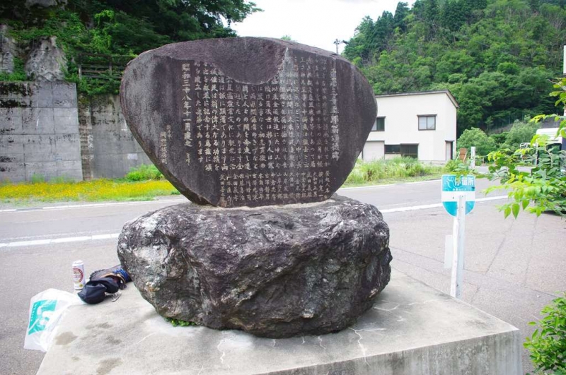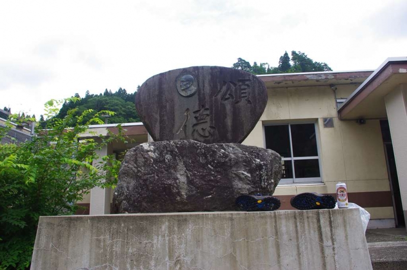 駅前にある石碑は昭和38年11月に建立された元小谷村村長の戸澤三千太郎翁の頌徳碑。登山者が靴とビールを置いている。