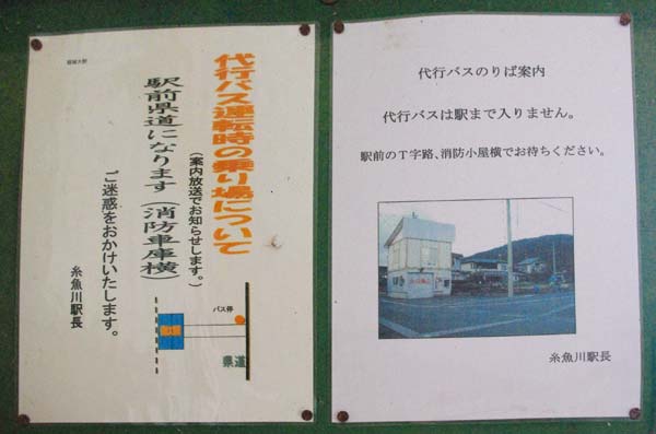 代行バスの乗り場案内。駅では時々代行バスの運行状況の案内放送がかかる。