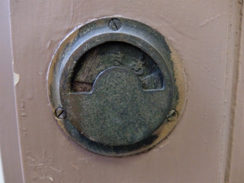 2〜4階の階段部分のステンドグラスっぽい窓。黒い縁取り部分はガラス面にぴったり密着した素材だけど色部分のコーティングは剥がれてる。竣工当時からの仕様だろか。