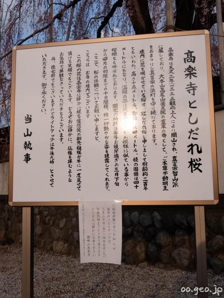 髙楽寺の枝垂れ桜 今年のライトアップ予定(八王子市 高尾) 八王子市 2016.03.27 2023.03.28 高楽寺 今年のしだれ桜のライトアップ期間 2016年度3月30日(水)~4月5日(火) 午後9時まで ※天候・咲き具合により変更する場合あり。 〒193-0941 東京都八王子市狭間町1868 2016年3月27日の咲き具合 高尾山・高尾界隈