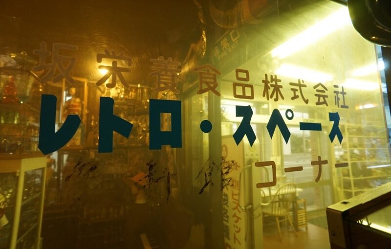 ▼レトロスペース坂会館の売店(ビスケット売り場)。大変な暴風の日だったので、通常の入口は閉鎖され、売店が入場口になっていた。入場無料の代わりに、ビスケットを買ってくれるように促される。