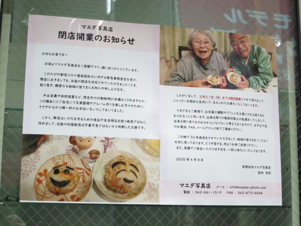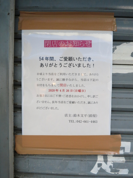 こちらもコロナのせいで閉業…?と思ったら、そうではなく、不要不急の業務と判断して、5月末日までシャッターを閉めた状態で仕事する「閉店開業」の状態に入ったらしい。 閉業ではなくて良かった。店は建て替えられたようだが、50年もの歴史があるとのこと。