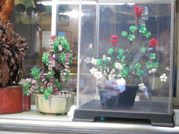 ある商店の店頭に、先日自分が通販で買ったのと同じもののように見えるビーズ盆栽が飾ってあって、おお!と嬉しくなってしまった。実物を見ずに通販で購入し、商品が届いたときはプラスチックのビーズが安っぽく感じられてがっかりしたけど、こうやって見ると逆にチープ感が良い味出して可愛いく思える。今も普通に販売されている商品なのだけど、どう見てもレトロな製品にしか見えない。