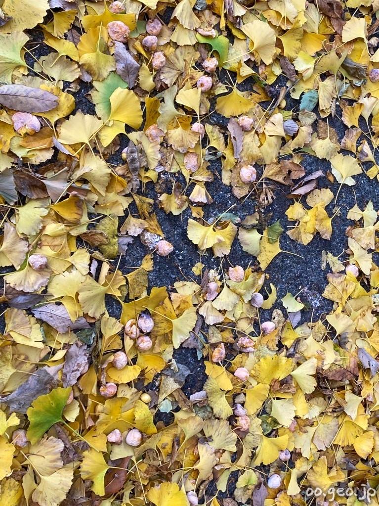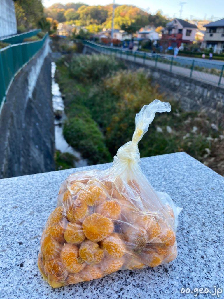湯殿川沿い、医療センターの下で銀杏を拾った。