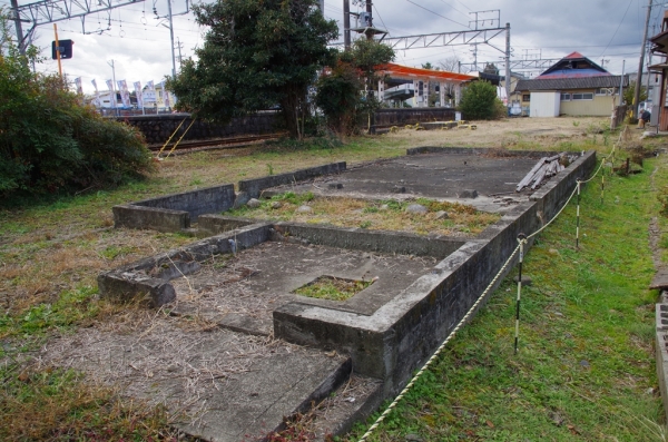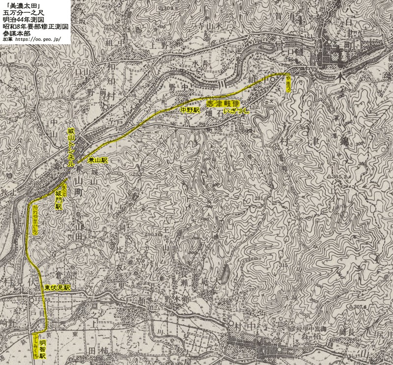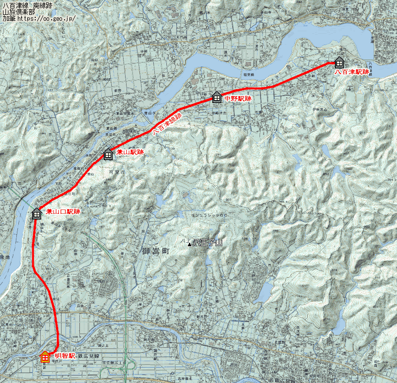 名鉄広見線と八百津線の分岐。駅付近にある何かの基礎土台は鉄道施設か民家か。