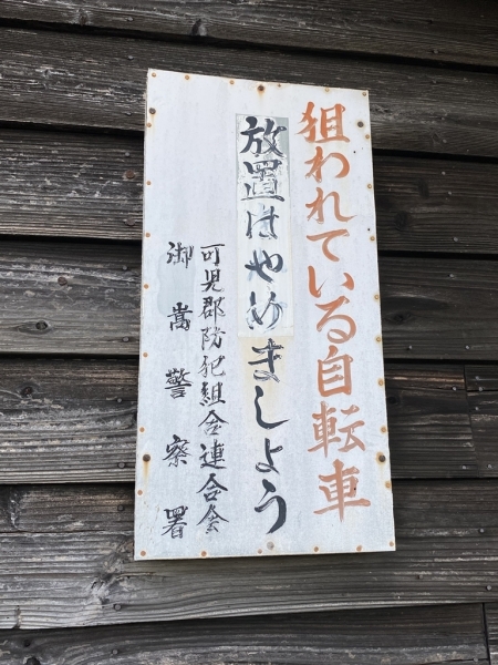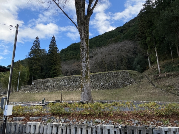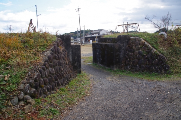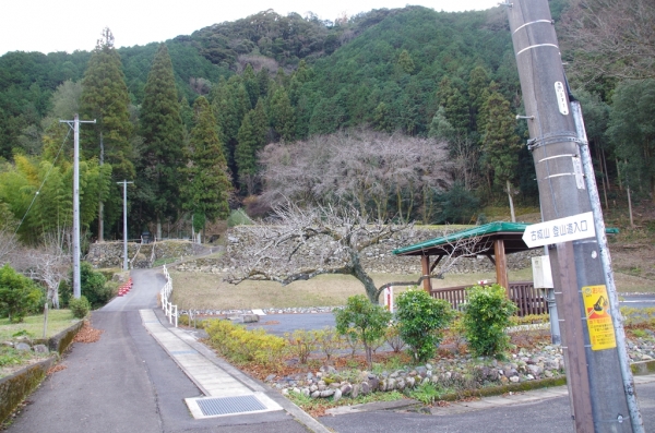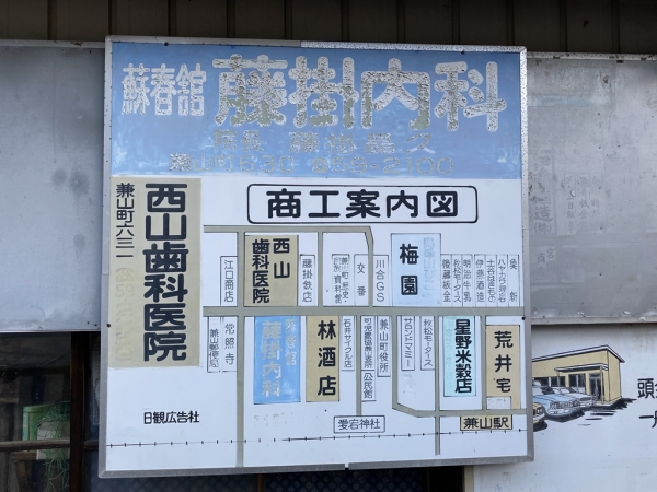 八百津線の橋台の間の道から古城山に登れるようだ。かつて兼山駅があったあたりは「みんなの駅ひろば」として生まれ変わり、更地になっている。近くに古い木造家屋や看板があり、なまこ壁風の公衆便所があった。