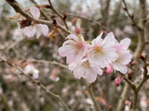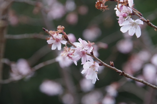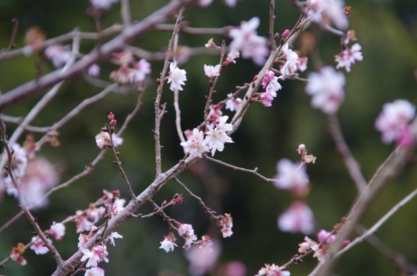 舗装されて遊歩道になった道路のわきには比較的若そうな十月桜の木が植樹されている。 高尾山付近の桜も10日ほど前に咲いていたけど、今年は桜の開花が全国的に狂っているのか。それともそういう品種なのか。