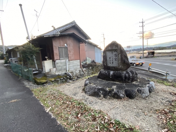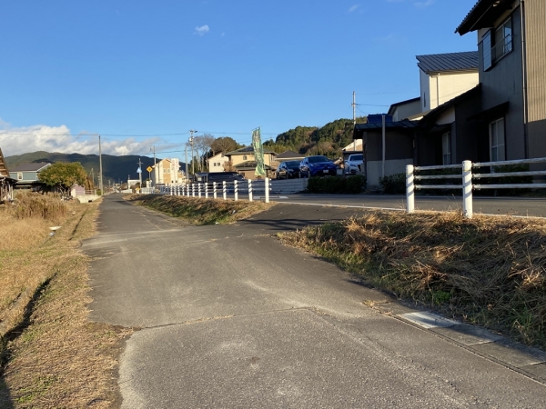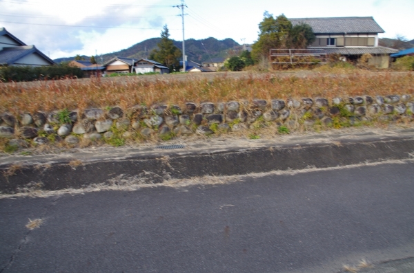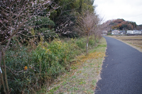おそらくこのあたりが伊岐津志駅(いぎつしえき)跡でないかと思うが、さっぱりわからない。さらに車道と歩道、どちらに転用されたのかわからない廃線跡を突き進む。犬の散歩をしてる人がいた。