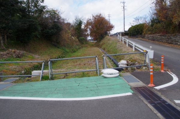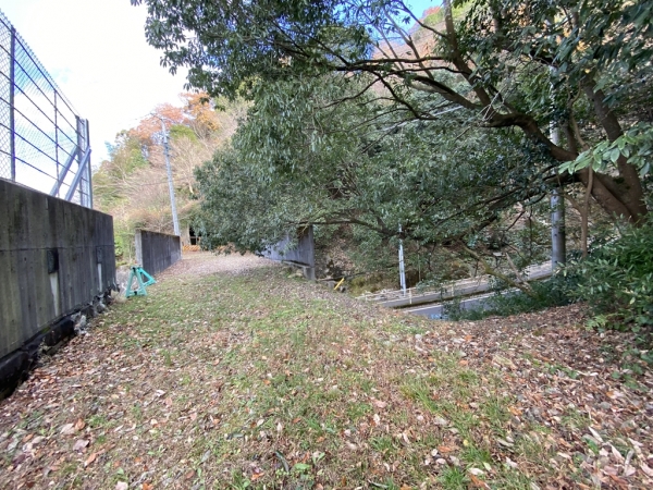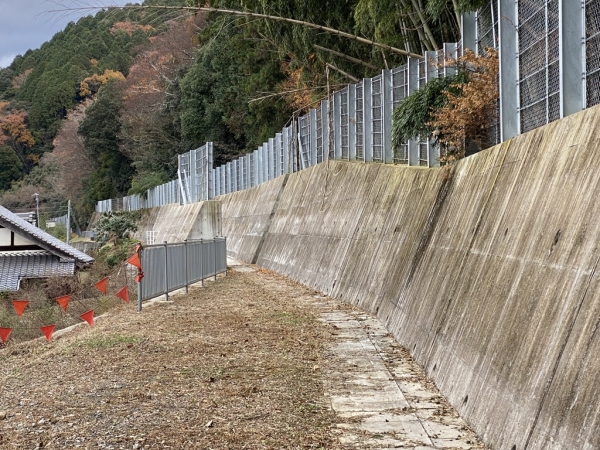 急傾斜地沿いにある廃線跡は、急傾斜地崩壊対策工事の擁壁によって埋め立てられていた。通行できるにはできるが、途中かなり道幅が狭くなっている。