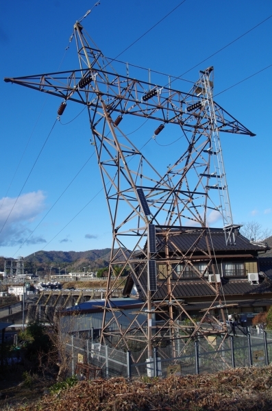 住宅地内の、特に変化のない廃線跡に沿って進む。廃線跡とともに住宅地内に溶け込む烏帽子鉄塔。兼山発電所につながってる。いつか兼山ダムとともに訪れてみたい。