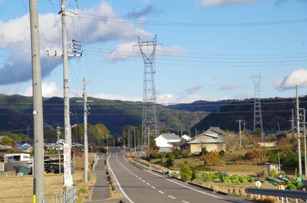 広々とした平地の中の廃線跡を突き進む。平地のど真ん中にででんと立つ高層の烏帽子鉄塔が象徴的だ。