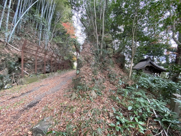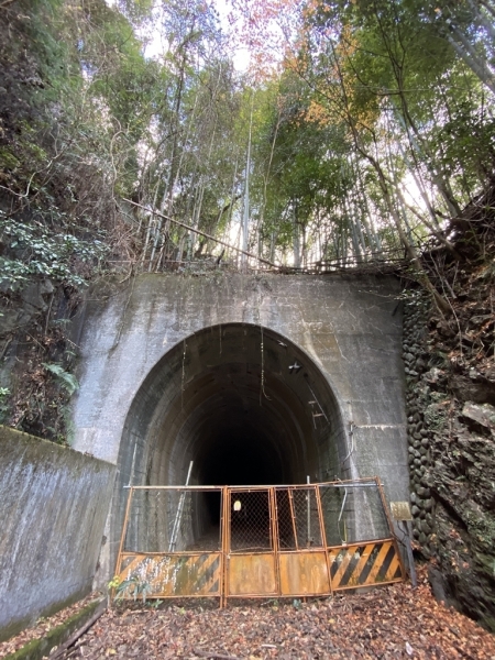 県道351号御嵩川辺線の手前、ちょうど常照寺の上手で擁壁が途切れ、開けた場所に出る。多分このあたりが城門駅(きどえき)跡。正面をみると城山トンネルがぽっかり口を開けている。