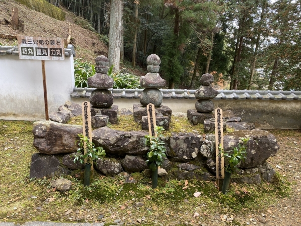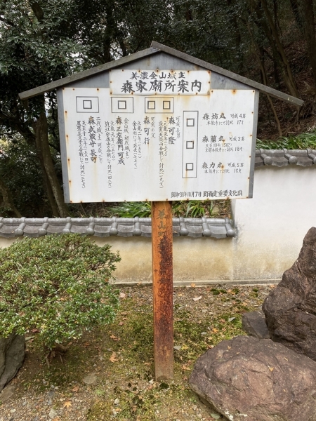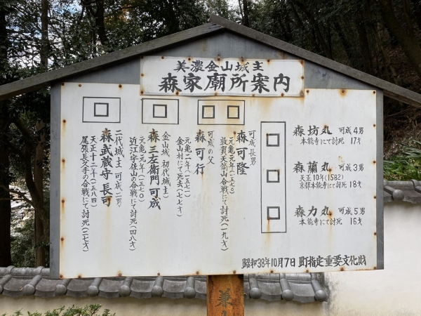 擁壁の切れ目に「森家の墓地」の案内板あり。 小道を登ってみると森蘭丸3兄弟の墓(森家廟所)があった。 昭和38年10月7日に町の重要文化財に指定さている。八百津線が廃線になる前、人々は線路を渡ってここに訪れていたのだな。