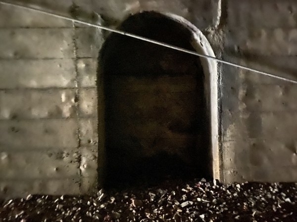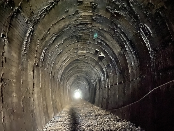トンネルは途中で内径が狭くなっている。暗くて退避坑はよく見えない。