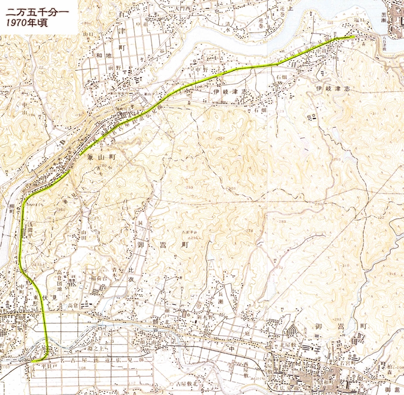 一般国道21号の伏見跨線橋方面に向かって歩くと、途中から廃線跡が舗装されて遊歩道になってる。