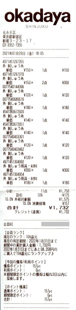 このオカダヤ新規会員登録500ポイントプレゼント、2021年1月11日~2021年4月25日の3ヶ月限定だったみたい。良いタイミングに入会できた~。