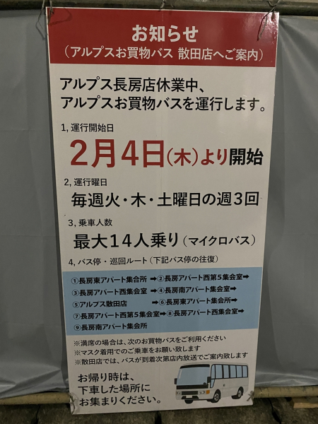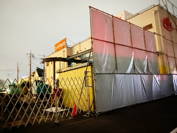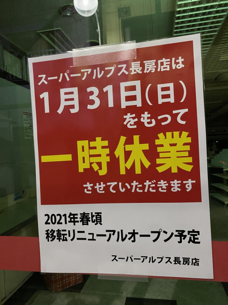 スーパーアルプス 長房店が解体されていた。駐車場はほぼ解体され尽くしていた。一瞬、泣きたくなったが、閉業ではなく、リニューアルとのこと。良かった…と思ったが、「移転」と書いてあるので、アルプスはこの場所から消えてしまうらしい。やっぱり泣きたくなった。