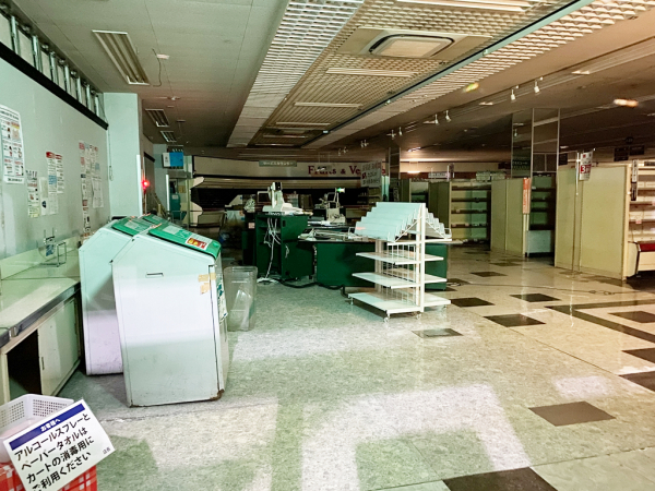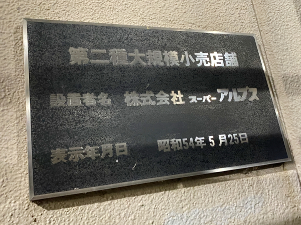 昔は2階に銭湯のあるスーパーだった。時代は違うが、大館のジャスコも2階に健康ランドがあった。2000年に廃止された大規模小売店舗法の表示。長房のアルプスは1979年頃の開店時から銭湯があった。大館ジャスコの2階の健康ランドは後々作られたもの。1990年頃か。