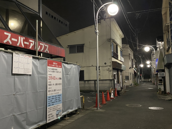 ※近くにある「たかおか食器店」さんのお話によると、スーパーアルプスができる前、同地にもともと銭湯があったらしい。銭湯を潰してスーパーを建てると風呂なしの住民が困るということで、スーパーの2階に銭湯が作られたとのことだった。同地で50年間食器店を営んでいるご主人のお話。