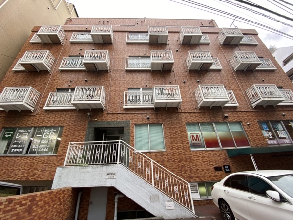 アップリンク渋谷近くの昭和なマンション、サンエルサビル。白いバルコニーがオサレ。1878年(昭和53年)1月築らしい。