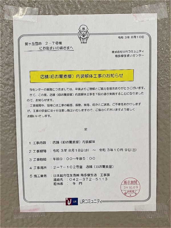 その後、館ヶ丘団地名店街に立ち寄ったら、そば処しなのが閉業していた。内装解体工事の貼り紙があったのでリニューアルか?と思ったが、検索してみたら2021年3月31日をもって閉店したとの情報。残念。