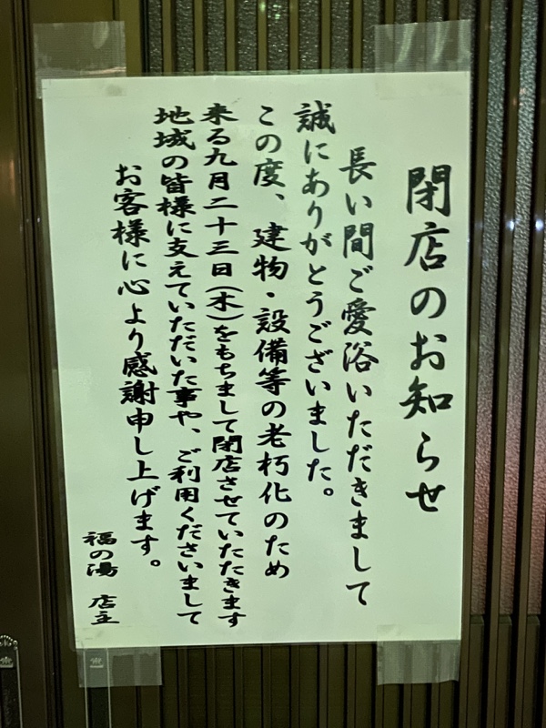 虫の知らせというんだろうか。最近「ふっと思い出して気になり出かけてみると閉業していた」というケースが多い。久しぶりに銭湯に行きたくなり、八王子の福の湯に出かけたら、閉業していた。9月23日をもって閉業したらしい。どうしていつも閉業後に虫の知らせがくるのか。最後にもう一風呂浴びたかった。