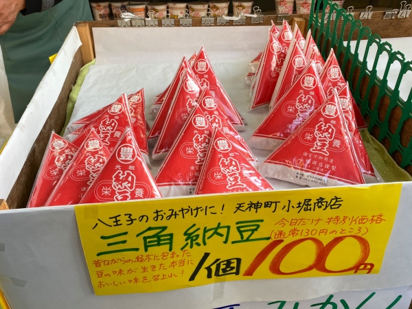 甲州街道沿いの末広ストアー(末広屋)で「三角納豆」というものを見つけて買った。いちょう祭り限定価格で1個130円→100円と安くなっていた。天神町 小堀商店のオリジナルらしい。初めて知った。あとでよく味わって食べよう。
