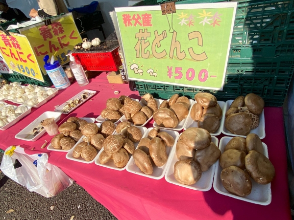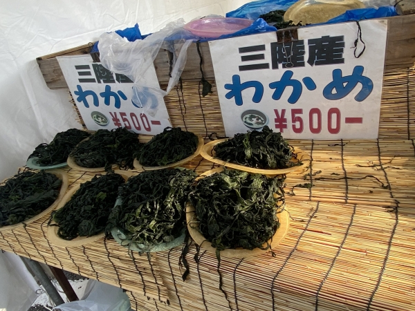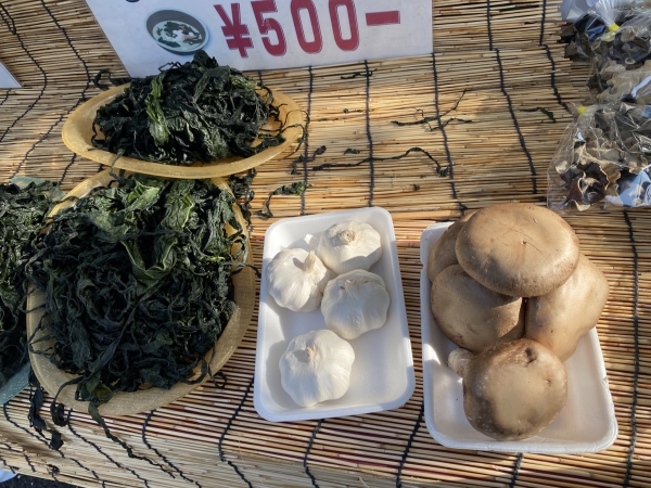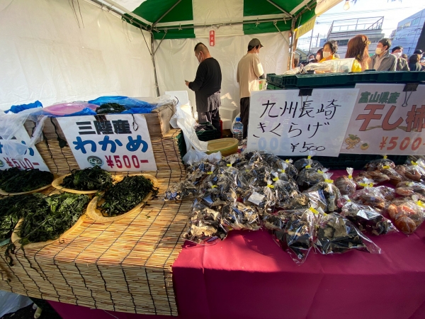 陵南会館(陵南いちょう会館)広場で、地域の物産品を買う。カナダイ商事さんのブース。どれでも3つで1000円。山盛りの三陸産わかめ、九州長崎きくらげ、富山県産の干し柿、秩父産の花どんこ椎茸、青森県産のにんにくなど。わかめと花どんことにんにくを購入。