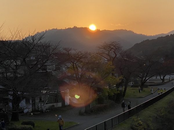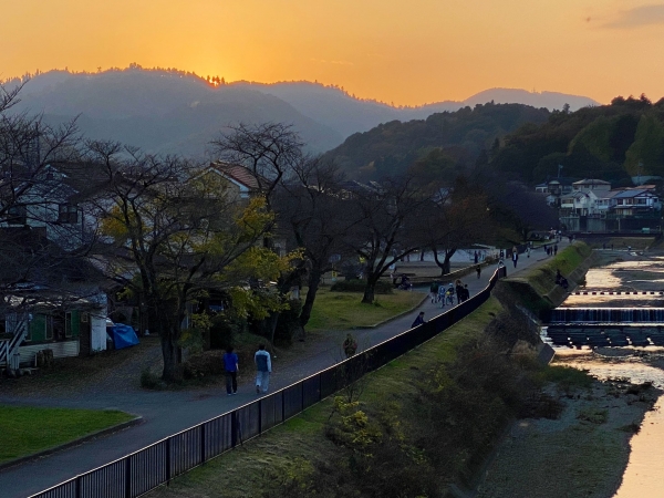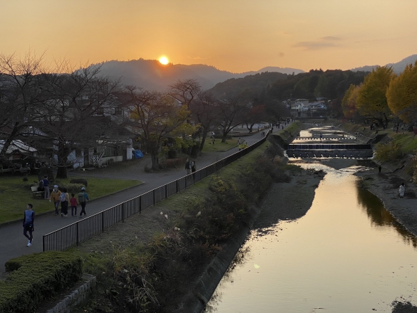 高尾山と南浅川に夕日が沈んでいく。