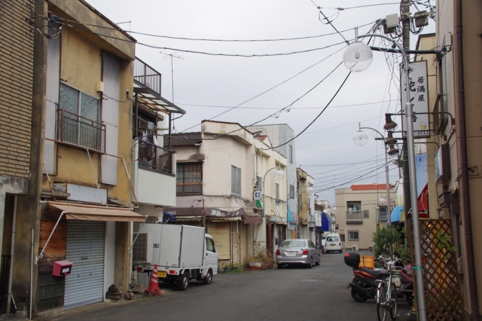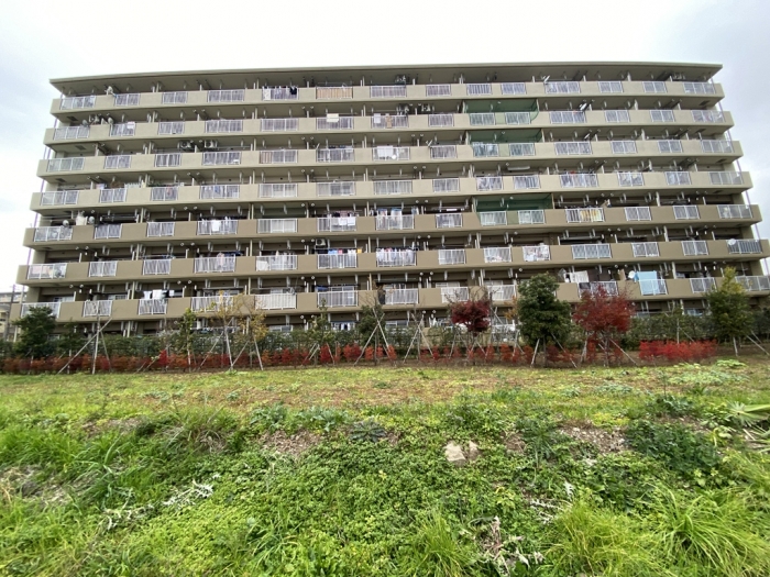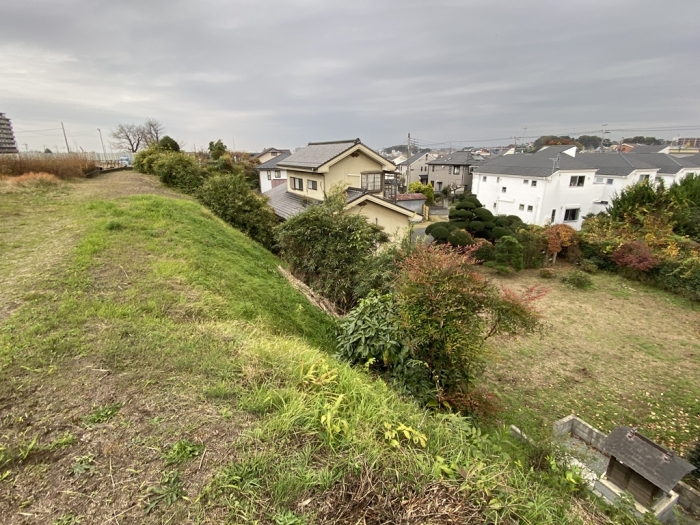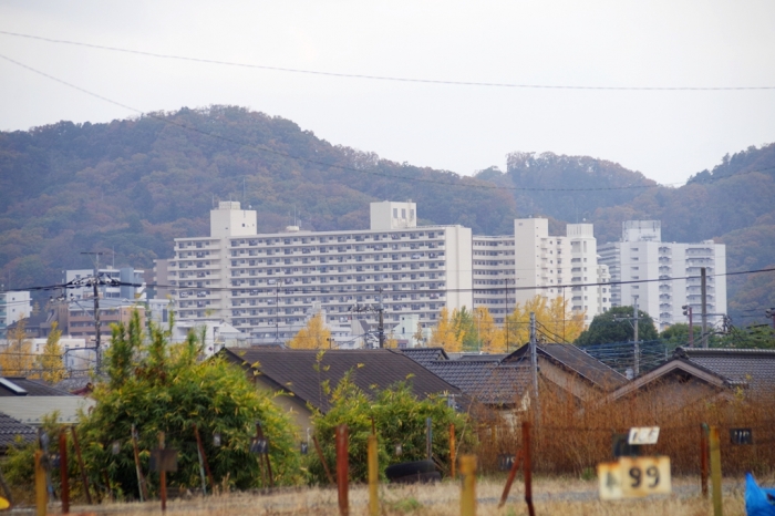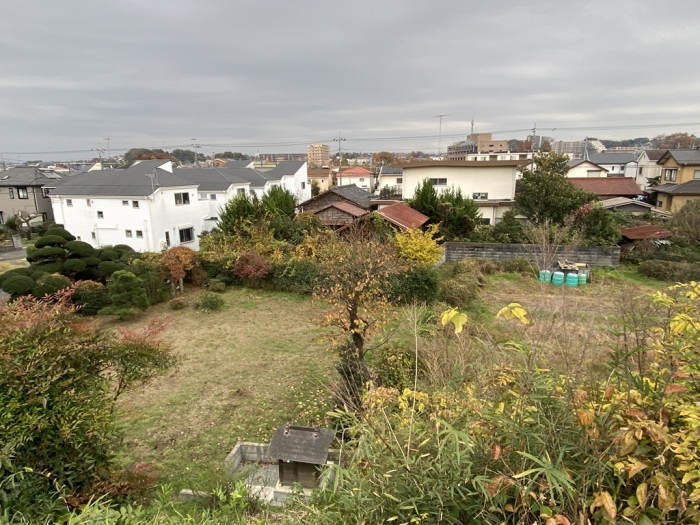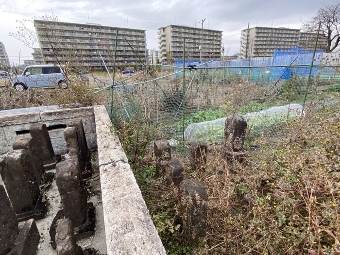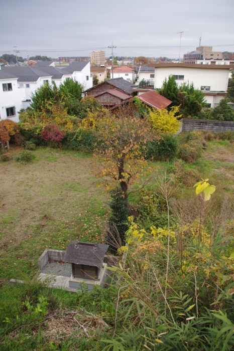 三軒在家から長房南アパートの方に向かう。古い墓や畑や未舗装の小道の遠方に都営長房西アパート&南アパート高層住宅群が見えるのはとても長房団地らしい風景のようにも感じる。
