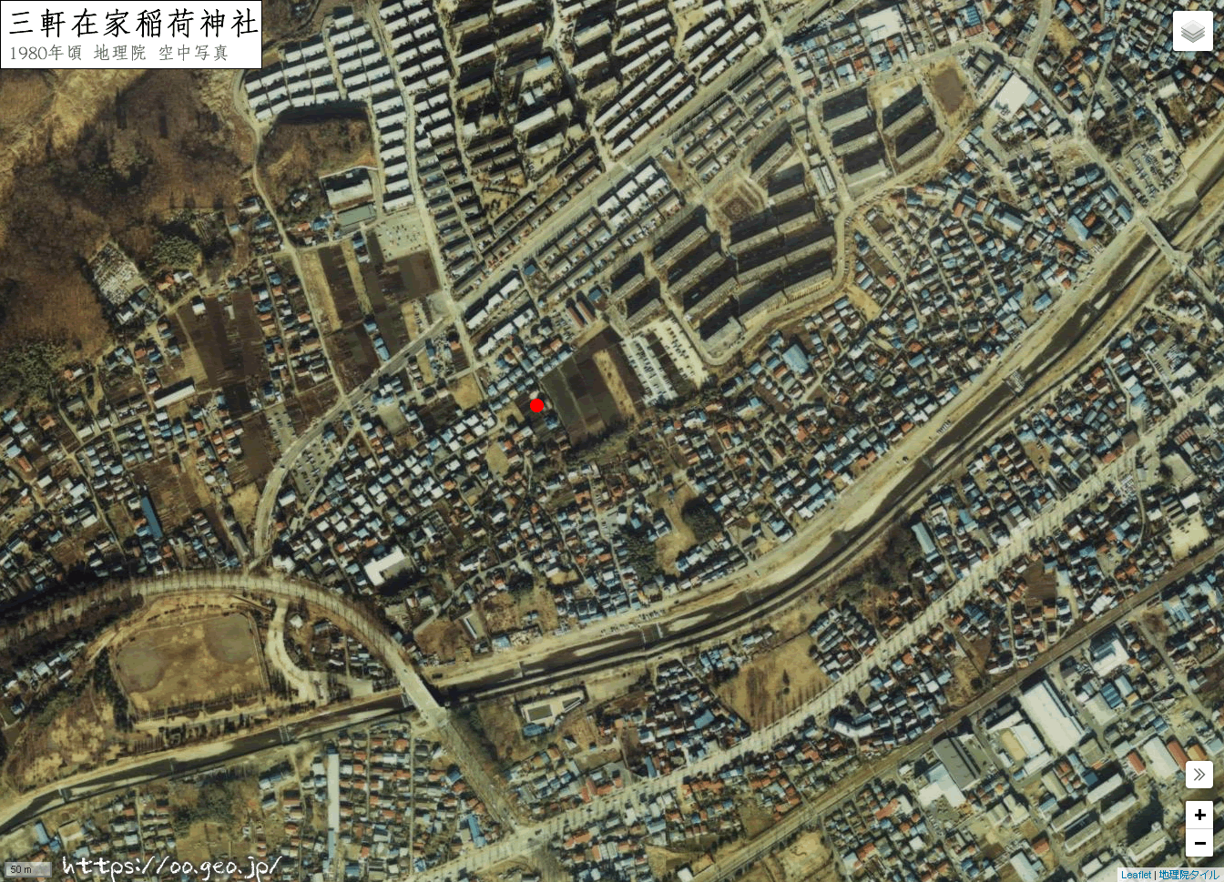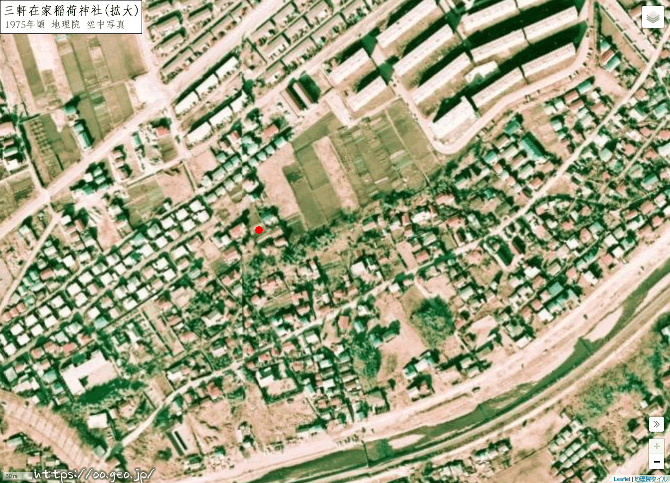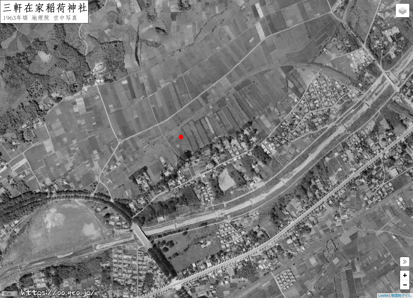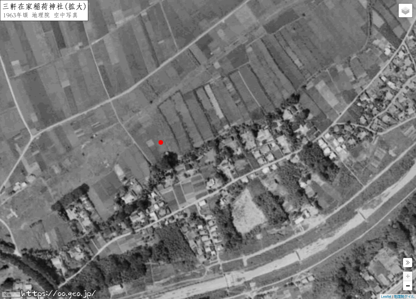 | 三軒在家 拡大地図 1963年頃の空中写真|1975年頃の空中写真|1980年頃の空中写真|1985年頃の空中写真|1990年頃の空中写真|地理院標準地図|地理院空中写真|OpenStreetMap| 別ウィンドウ表示 ※画像の読み込みに時間がかかります。 |