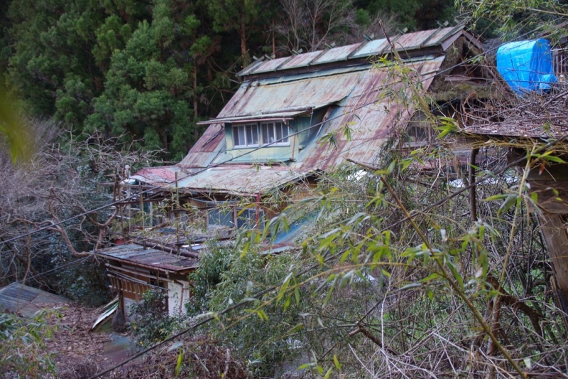 山の斜面に這いつくばるように建てられた大きな古い家屋。既に廃屋となっている。