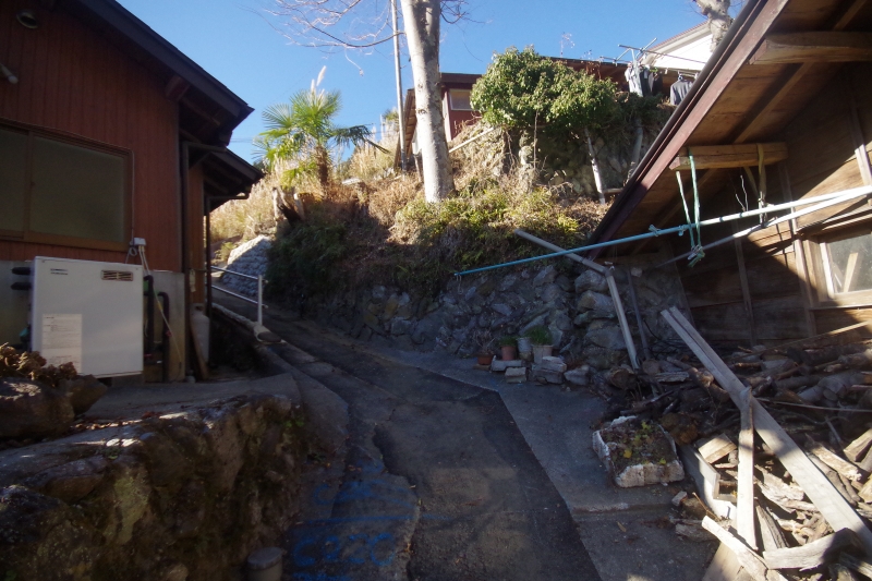 大澤の路地は細い。先月、ここで水道工事をしていた。その部分のアスファルトが新しくなっている。