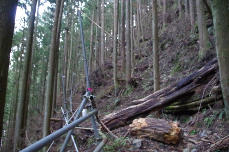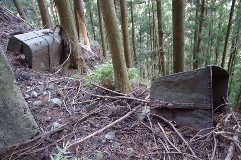 これついては【山さ行がねが】廃線レポート 奥多摩鉱業氷川鉱山 専用索道跡 第3回さんが詳しいので、そちら参照。等高線がゆるやかなのでなめてかかってしまったが、想像以上の急傾斜で正直滑落の恐怖を感じた。断るまでもないかもしれないが、途中、道はない。部分的に道らしき筋が出てくるが、急に岩壁が出てきたりもする。恐ろしい。