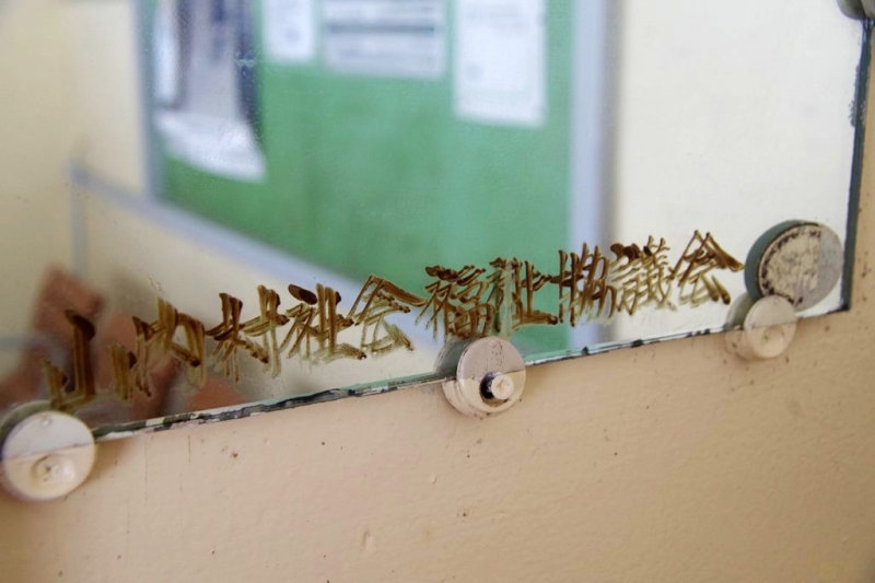 待合室内にかかっている鏡は古い。「在宅福祉を高めましょう」