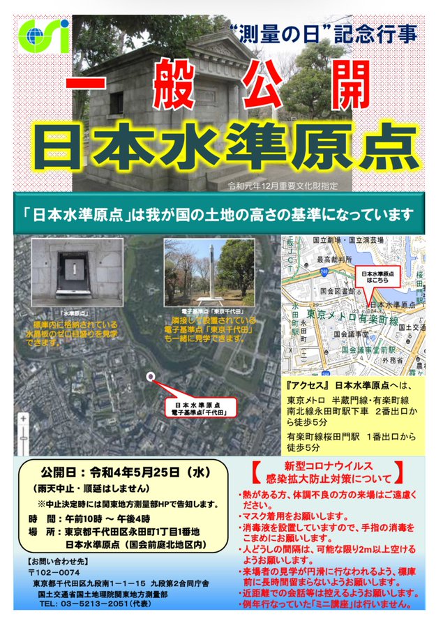 日本水準原点 一般公開 見学 「測量の日」は6月3日だが、日本水準原点の一般公開はなぜか5月25日開催。6月1日~3日は新宿駅西口広場イベントコーナーで「くらしと測量・地図展」が開催される。