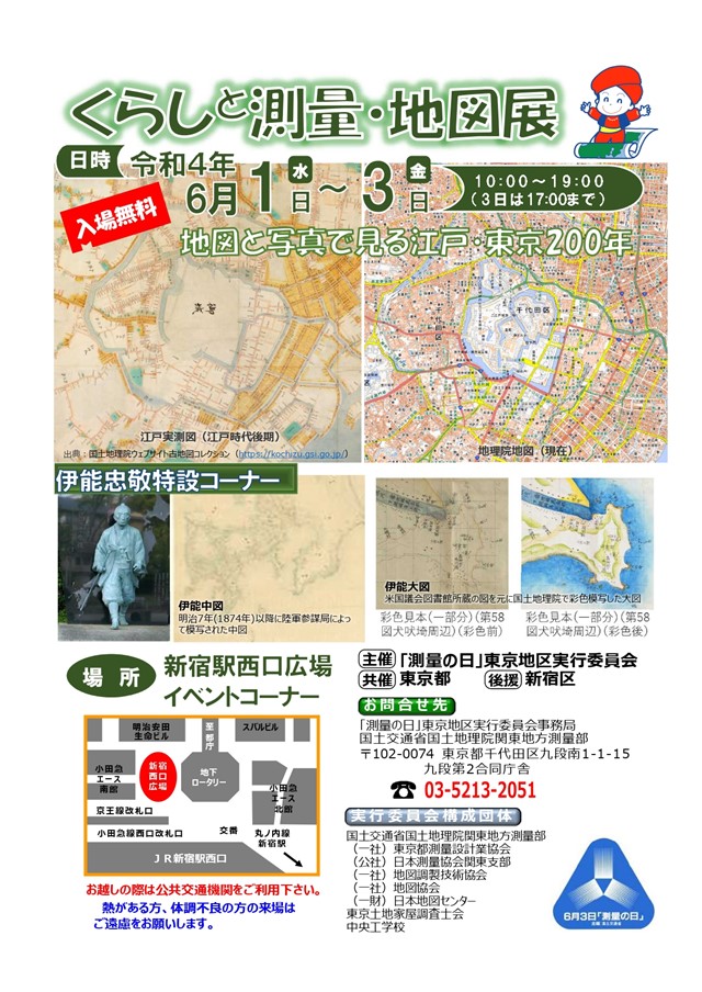 6月1日~3日は新宿駅西口広場イベントコーナーで「くらしと測量・地図展」が開かれる。