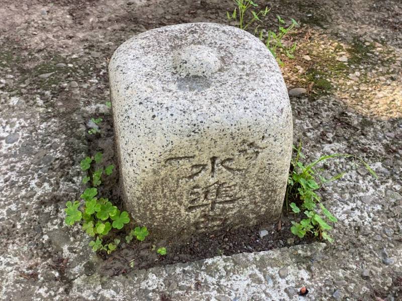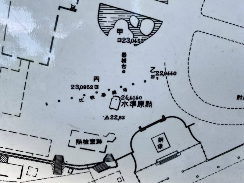 船形台石の先端に水晶板がはめ込まれている。水晶板目盛りの0表示の所が標高24.3900の位置らしいが、目盛りが薄くなっていてほとんど読めなかった。