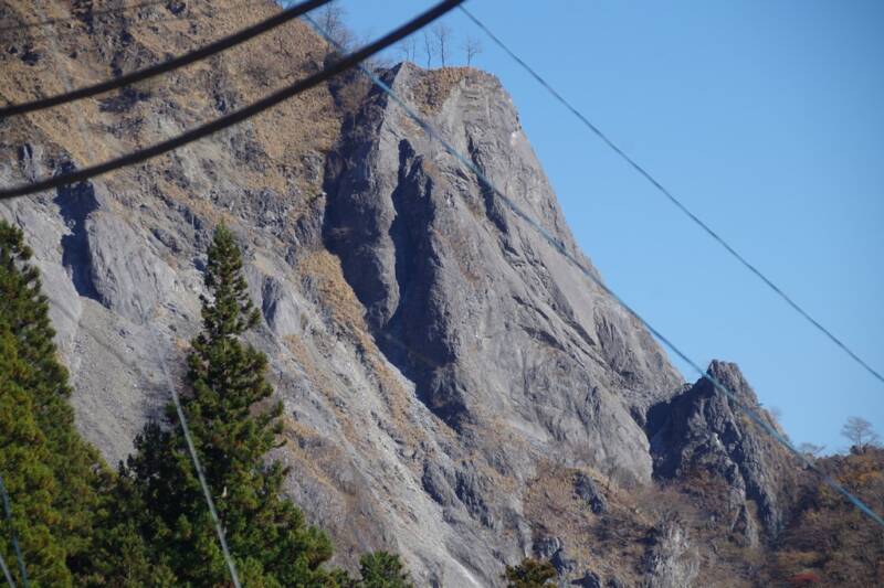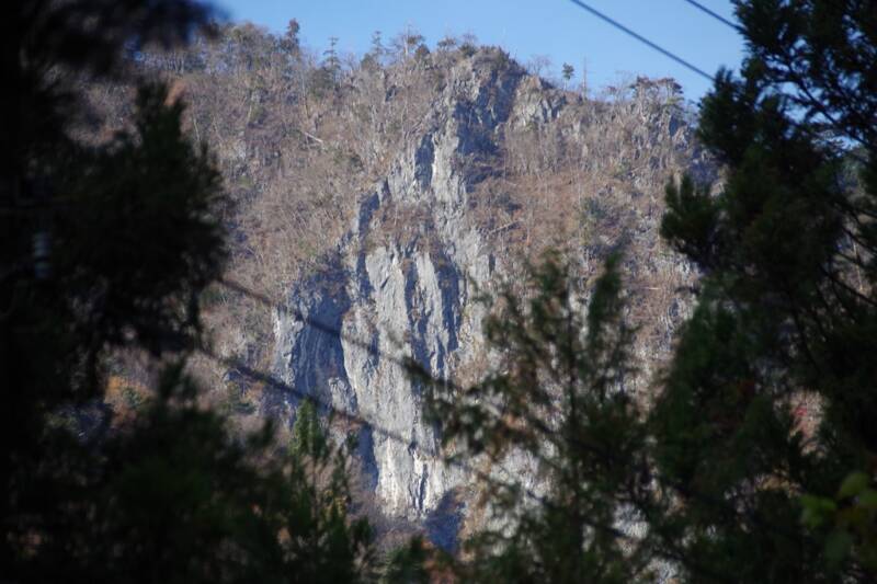岩松尾根バス停から登竜橋(一原バス停付近)まで、路線バスはずっと氷川鉱山下のトンネル内を走行するので、周りの景色などはわからないのだが、静和旅館付近からそのあたりの岩場が見える。迫力ある。